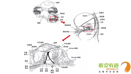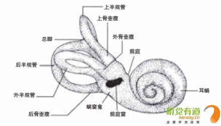 內耳或稱迷路,分為三個部分:半規管、前庭和耳蝸,負責聽覺的是耳蝸部分,外有骨殼,名骨迷路。耳蝸,顧名思義,像蝸牛殼一樣,耳蝸旋繞2.5~2.75圈。骨迷路的內壁被骨性螺旋板分成三部分,這三部分組成了三個錐形管腔(階),外面兩層含有淋巴液,頂部是前庭階,底部是鼓階,中間較小的三角形管腔是中階,又叫膜迷路,其中含有聽神經末梢分支。