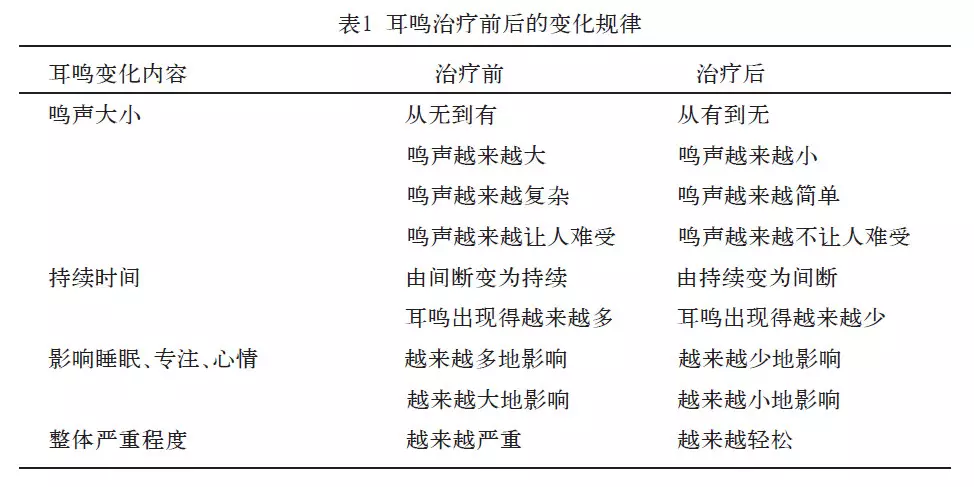 筆者發現以下三方面對耳鳴療效至關重要,①耳鳴患者最希望了解耳鳴的病因。因此,醫生應給予患者希望,向他解釋清楚耳鳴是由于沒有善待自己,身體發出的善意警報,只要患者改變自己,警報自會解除,所以耳鳴可以治好。②治療前,需詳細了解病史,不僅是耳鳴病史,耳鳴之外的其他不舒服以及治療情況同等重要。醫生和患者均需將患者作為一個整體來看待。只有這樣,才能教會患者和醫生觀察身體不適的變化,并通過不斷將這些變化與患者的生活方式之間形成關聯,理解生活方式與不適之間的關系,不斷地糾正不正確的行為方式和思維模式,達到從根本上獲得健康。③耳鳴治療過程中,醫患雙方不斷的交流必不可少,其核心是通過交流,幫助患者明確耳鳴治療的原理、過程和結果,為患者答疑解惑,使患者不斷修正自己,堅持正確的治療方向和方法,達到最快最好的療效。醫患雙方交流的時間和內容因人而異,具體情況具體分析。耳鳴的成功康復有賴于醫患雙方的信任、耐心和決心。