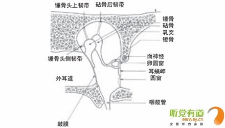 <span style="font-size:16px;"> 中耳結(jié)構(gòu)包括鼓室、咽鼓管、鼓竇和乳突腔四部分。鼓室內(nèi)有聽骨、肌肉、韌帶和神經(jīng)。中耳是換能器,換能是將一種能量形式轉(zhuǎn)換成另一種能量形式,中耳通過鼓膜和聽骨鏈將聲能轉(zhuǎn)換為機械能,再由鐙骨底板將機械能轉(zhuǎn)換為內(nèi)耳的液態(tài)能。</span></p><p><span style="font-size:16px;"> 鼓膜是中耳和外耳的分界,呈橢圓形,中間稍向內(nèi)凹陷,色灰白,較透明,與耳道底約呈30°角。鼓膜寬約8mm,高約9mm,厚0.1mm,質(zhì)地韌,其構(gòu)造分三層:外層是皮膚層,中層由淺層的放射狀和深層的環(huán)狀纖維組成,它們使得鼓膜能承受一定的氣壓和水壓并抗感染,內(nèi)層為粘膜層,與鼓室粘膜相連續(xù)。聲音的振動,即聲能,通過耳郭和耳道共振的加強,引起鼓膜隨之振動,鼓膜與中耳的錘骨相連,在正常耳,錘骨懸掛在自鼓膜頂端至下2/3處。錘骨柄的尖端將鼓膜頂向中耳,形成錐形鼓膜的頂,稱作臍。自臍向前下達鼓膜邊緣有一個三角形的反光區(qū),名光錐,是外來光線被鼓膜的凹面集中反射而成。鼓膜下4/5為緊張部,上1/5由于缺乏纖維層而較松馳,稱為松弛部。鼓膜可分為前上、前下、后上、后下四個象限。兒童的鼓膜薄而有彈性,年齡越大,鼓膜越厚且越僵硬。鼓環(huán)將鼓膜固定在某一位置,使其成為在外耳和中耳之間的一層防水防氣的屏障。</span></p><center><span style="font-size:16px;"><img alt="" src="/upfiles/201810080137189845.png" width="440" height="250" /></span></center><p></p><p><span style="font-size:16px;"> 中耳鼓室</span></p><center><span style="font-size:16px;"><img alt="" src="/upfiles/201810080137242362.png" width="440" height="250" /></span></center><p></p><p><span style="font-size:16px;"> 正常鼓膜像(左)</span></p><p><span style="font-size:16px;"> 在中耳腔內(nèi)的聽骨是人體最小的骨頭,分別叫作錘骨、砧骨和鐙骨。這些聽骨由韌帶連接并懸掛起來形成了聽骨鏈。錘骨柄附在鼓膜上,錘骨頭與砧骨頭形成錘砧關(guān)節(jié),砧骨底與鐙骨頭形成砧鐙關(guān)節(jié),鐙骨底板由環(huán)狀韌帶固定在卵圓窗上。聽骨鏈利用杠桿原理使來自鼓膜的機械能放大,傳遞到卵圓窗。</span></p><center><span style="font-size:16px;"><img alt="" src="/upfiles/201810080137303051.png" width="440" height="250" /></span></center><p></p><p><span style="font-size:16px;"> 聽骨鏈</span></p><p><span style="font-size:16px;"> 咽鼓管是中耳通氣引流的唯一途徑,也是中耳感染的主要途徑。它的一端開口在較高的中耳鼓室腔,另一端開口在較低的鼻咽部,通過咽鼓管在鼻咽部的開口,空氣可從外界直接進入中耳腔。咽鼓管平時處于關(guān)閉狀態(tài),能較好的防止細菌感染,只有在咳嗽、擤鼻涕、打哈欠或吞咽時,咽鼓管才開放。當咽鼓管開放時,根據(jù)鼓膜外側(cè)的壓力情況,空氣或者從中耳流向外界,或者從外界流向中耳,使中耳壓力得以平衡。</span></p><p><span style="font-size:16px;"> 更多詳情請登錄www.hljhqw.com</span></p>" />