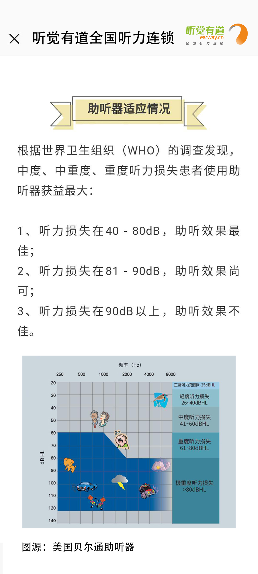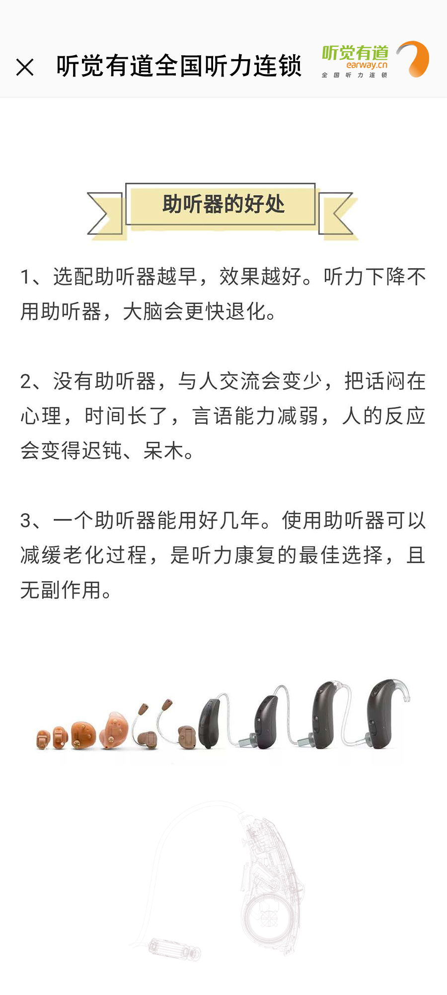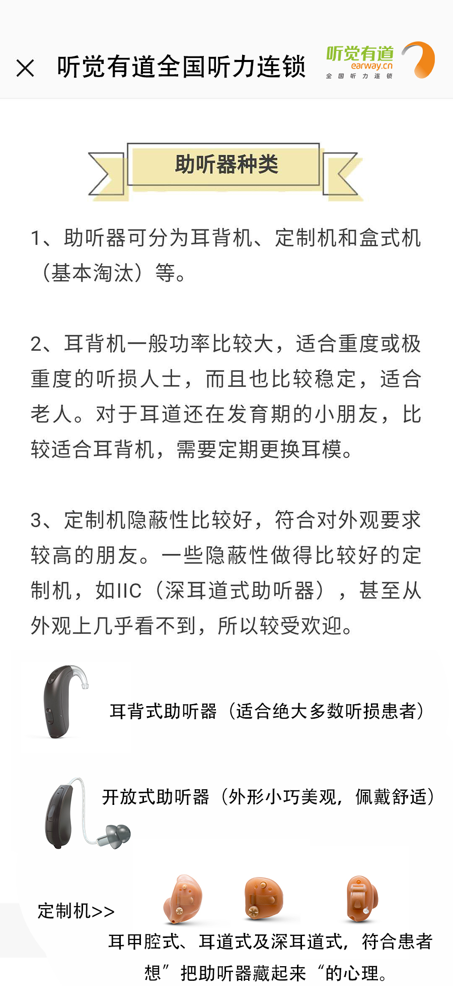 什么是助聽器?長什么樣子?有什么作用?如何使用?這里一一告訴您!</p><p> 助聽器是聽力障礙者使用的輔具,用來補足聽力損傷所造成的缺陷。廣義上講凡能有效地把聲音傳入耳朵的各種裝置都可以看作為助聽器,狹義上講助聽器是一個電聲放大器,通過它將聲音放大,使聽障者聽到了原來聽不清楚、聽不到的聲音。</p><p> 第一:助聽器的種類</p><p style="text-align: center;"><img src="/upfiles/201901180318143583.jpg" width="640" alt="" /><br /></p><p> 第二:助聽器的好處</p><p style="text-align: center;"><img src="/upfiles/201901180318334139.png" width="640" alt="" /><br /></p><p> 第三:如何適應助聽器</p><p style="text-align: center;"><img src="/upfiles/201901180318506440.jpg" width="640" alt="" /><br /></p><p> 第四:選配助聽器流程</p><p style="text-align: center;"><img src="/upfiles/201901180319039646.jpg" width="640" alt="" /><br /></p><p style="text-align: center;"><br /></p><p> 更多詳情請登錄www.hljhqw.com</p>" />