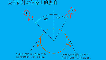 例如,如果信號在正前方偏右30o,噪音在正前方偏左60o,那么在右耳的平均信噪比增加量為9dB,而在左耳,平均信噪比增加量為-8db,也就是說右耳的信噪比比無衍射效應時增加了9dB,比左耳信噪比多17dB。