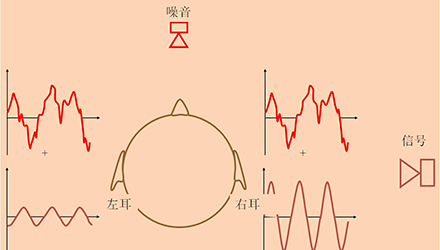 雙耳交叉抑制:假設噪音從正前方傳來,到達雙耳的振幅和相位相同,純音信號從右側傳來,因此純音到達右耳的振幅比左耳大,如果大腦將右耳接受的總聲波減去左耳的總聲波,結果噪音的聲波就被完全解除了,剩下的聲波形態應該與右耳波形類似。