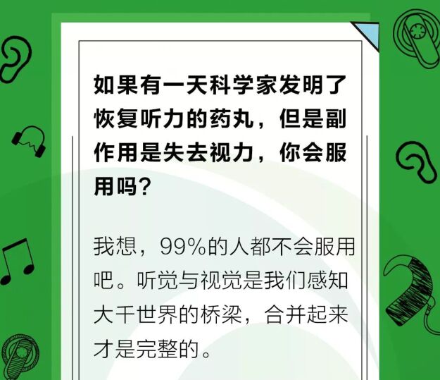 2019年3月29日聽覺有道推出一個(gè)全新的欄目?jī)?nèi)容<br /> 一本正經(jīng)地奇思妙想<br /></span><p><span style="font-size:16px;"> 內(nèi)容全靠一張圖:</span></p><p style="text-align: center;"><span style="font-size:16px;"><img src="/upfiles/201903290834583126.jpg" alt="" /><br /></span></p><span style="font-size:16px;"> 言語(yǔ)雖然不多僅僅三兩句<br /> 大家隨便看看就行了<br /> 可我們一定得往心里去啊<br /> 嚴(yán)肅點(diǎn):愛耳君估計(jì),99%的人心里都在想,誰(shuí)會(huì)那么傻會(huì)做“拆東墻補(bǔ)西墻”的事情呢。<br /> 在現(xiàn)實(shí)中,很多恢復(fù)聽力藥物的研究就尚處于這個(gè)階段,我們?cè)谛侣勆峡吹娇茖W(xué)家已經(jīng)可以讓小老鼠通過注射藥物等方式恢復(fù)聽力,然而我們沒有看到的是,這類方式目前還不能控制其極大的副作用,這種副作用可不僅僅是失明那么簡(jiǎn)單,有可能還會(huì)丟掉性命。<a href="http://www.hljhqw.com/listDetail.aspx?id=102818" target="_blank"><strong><span style="color:#3333ff;">五個(gè)不容易被察覺的耳部疾病</span></strong></a><br /></span><p><span style="font-size:16px;"> 誠(chéng)然,科研的每一分進(jìn)步都難得可貴,未來(lái)會(huì)是怎樣的,愛耳君不知道。愛耳君希望有朝一日科學(xué)家能真正發(fā)明出一款“沒有副作用”的藥丸,讓全天下聽障人士都能恢復(fù)聽力。但我們也需正視現(xiàn)實(shí)把握當(dāng)下,早發(fā)現(xiàn)、早干預(yù)、早治療。</span></p><span style="font-size:16px;"> 相關(guān)推薦閱讀:<a href="http://www.hljhqw.com/listDetail.aspx?id=102841" target="_blank"><strong><span style="color:#3333ff;">如何正確應(yīng)對(duì)聽力損失?聽力保健的8大誤區(qū)</span></strong></a><br /><br /><br /> 聽覺有道助聽器價(jià)格:http://www.hljhqw.com/products.html<br /><br /> 發(fā)布于2019年3月29日 星期五<br /><br /> 上午8:36分</span>" />