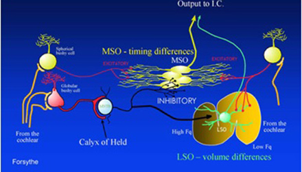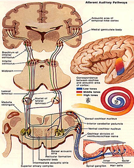 當人們提到“聽”,通常會直接聯系到耳,但聲音需行經許多神經纖維、通過很多神經核才到達聽覺中樞。在這些通路上,信號的聲學成分(比如頻率、強度、時間信息等)均由高度組織的神經系統編碼。事實上我們生來就具備聲信息編碼功能,大腦——尤其是中樞聽覺系統——會隨著聽覺剝奪或刺激而改變,在我們整個生命期限內,它會根據接收到的聲輸入不斷進行自我重組。