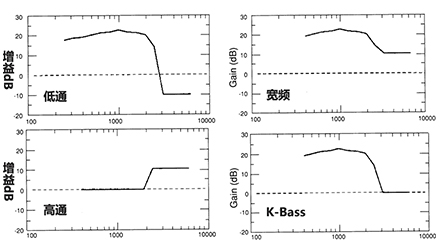在低通放大中,低頻有一定的增益,而高頻則有一些插入缺失(負增益);在高通放大中,低頻增益為零,高頻增益最多;在寬頻放大中,低、高頻都有增益,其中低頻有較大增益高頻,高頻有相對較少的增益;在K-Bass放大中,低頻增益明顯,高頻增益為零,剛好彌補插入缺失。