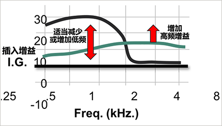 所以,在此建議可以逐步減少低頻增益(部分可適當增加低頻),增加高頻增益,慢慢調試,直到弱聽人士覺得合適,如下圖綠色曲線的紅箭頭所示。