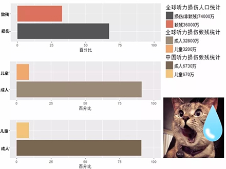 聽力損傷是發生率最高的致殘原因,還排在肢體傷殘之上。世界衛生組織的調查顯示,全世界約有11億人口有聽力損傷,其中達到致殘程度的約3.6 億,9% 為兒童 (3200萬)。中國是人口最多的國家,當然也是聽障人口最多的國家。按比率,這3.6億聽殘人口約有7400萬在中國,其中兒童約670萬。有數據顯示,19歲后,超過四分之三的人開始出現聽力損傷;65歲后,至少三分之一的人因聽力損傷致殘。