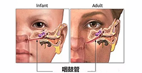 我們的耳朵里面,有一根管子,叫做“咽鼓管”,它是唯一一條中耳與外界相通的通道,位于鼻腔的后部。嬰幼兒的咽鼓管比較短,而且呈水平狀,細菌過來很容易進入,并且停留在此。