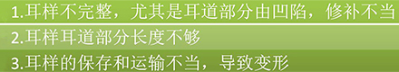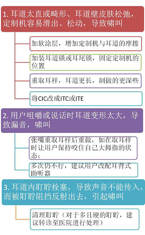 助聽器的嘯叫一直是困擾用戶和驗配師的主要問題之一,其中定制機的嘯叫問題尤其突出。</p><p> 定制機是根據病人的聽力狀況和耳道形狀定制的,每一臺的制作都是獨一無二的,因此出現嘯叫的原因也比標準制作過程的耳背式助聽器復雜得多,有些定制機甚至多次重做仍然不能排除嘯叫。</p><p> 但無論如何只要我們客觀、理智地對待嘯叫問題,找出癥結之所在,對癥下藥,那么減少甚至避免嘯叫的也并非難事。</p><p> 什么是嘯叫?</p><p> 所謂嘯叫就是助聽器發出刺耳的連續尖叫聲,術語上我們稱之為聲反饋,它可能是聲音反饋或電路上的正反饋。</p><p> </p><center><img alt="" src="/upfiles/201905070200484006.png" width="440" height="250" /></center><p></p><p> 內部嘯叫和外部嘯叫</p><p> 嘯叫分內部嘯叫和外部嘯叫兩種。外部嘯叫主要是定制機外殼或耳背機耳模與耳道不密封引起的,而其它原因引起的嘯叫可稱為內部嘯叫。</p><p> </p><center><img alt="" src="/upfiles/201905070200528641.png" width="440" height="250" /></center><p></p><p> 區分內部嘯叫和外部嘯叫</p><p> 區分內部和外部嘯叫時必須用聽筒,驗配師用聽筒連接到用戶反映有嘯叫的助聽器的出聲孔,可用橡皮泥密封接口和通氣孔,不使聲音泄漏出來,然后從聽筒內聽助聽器的輸出聲,若仍有嘯叫則說明助聽器有內部嘯叫,否則說明助聽器只有外部嘯叫。</p><p> 內部嘯叫的原因和排除</p><p> 內部嘯叫的主要原因有:</p><p> </p><center><img alt="" src="/upfiles/20190507020058626.png" width="440" height="250" /></center><p></p><p> 為了防止助聽器出現內部嘯叫,除了助聽器廠家對產品制作和檢驗把好關,對于驗配師和用戶來說,需要特別注意兩點:</p><p> </p><center><img alt="" src="/upfiles/201905070201041323.png" width="440" height="100" /></center><p></p><p> 外部嘯叫的原因和排除</p><p> 絕大部分用戶抱怨的定制機嘯叫是指外部嘯叫,外部嘯叫的原因和處理方法非常復雜,從定制機的整個驗配過程來看,我們可以將這些根原歸納到下面四大類:</p><p> 1.耳道</p><p> 耳道的客觀情況是產生嘯叫的主要原因,其可能引起嘯叫的原因及解決方法如下:</p><p> </p><center><img alt="" src="/upfiles/201905070201091323.png" width="482" height="780" /></center><p></p><p> 2.耳樣(印模)</p><p> 耳樣是定制機外殼制作的原型,耳樣的好壞直接影響到外殼完成后的密封性和舒適度,病人的聽力損失越重,對耳樣的要求也越高。在耳樣這一環節的如下情況將導致定制機嘯叫:</p><p> </p><center><img alt="" src="/upfiles/201905070201157387.png" width="440" height="80" /></center><p></p><p> 取耳樣是驗配師的基本功,必須在充分檢查耳道基礎上,膽大心細地取到合格的耳樣。</p><p> 3.選配和調試</p><p> </p><center><img alt="" src="/upfiles/201905070201216863.png" width="440" height="250" /></center><p></p><p> 選配最重要的就是做好外形和功率的平衡,不要為拉定單而勉強選配,如果用戶需要加大音量至幾乎滿檔才能使用,就容易出現嘯叫。</p><p> 助聽器增益設置(通過音量電位器或驗配軟件設置)的理想位置應該是在滿檔增益的二分之一到三分之二之間。</p><p> </p><center><img alt="" src="/upfiles/201905070201277561.png" width="440" height="250" /></center><p></p><p> 任何機型都有其選配范圍,如果超出此選配范圍,要讓助聽器始終在滿負荷下工作,即使沒有嘯叫,助聽器的失真、噪音等也會增加很多。</p><p> 因此選配合適的機型、線路和矩陣比重做外殼更合理、有效。</p><p> </p><center><img alt="" src="/upfiles/201905070201336863.png" width="440" height="250" /></center><p></p><p> 需要特別注意的是:價格單上的參考驗配范圍是指中高頻的值,但低頻一般會低20dB 左右,所以僅僅平均增益小于參考驗配范圍并不能保證每個頻率點都在驗配范圍內。</p><p> 加通氣孔是讓病人配戴更舒適的方法之一,但有時它也是產生嘯叫的禍首,此時減小甚至于堵塞通氣孔往往能立竿見影。堵塞氣孔可以用棉花或印模膏。</p><p> 對于一些中高檔機型帶反饋抑制功能的線路,可以設置反饋抑制的力度更大,一些輕微的嘯叫就能立刻消除。</p><p> </p><center><img alt="" src="/upfiles/201905070201384912.png" width="440" height="120" /></center><p></p><p> 4.制作</p><p> 關于定制機制作中避免外部嘯叫主要是助聽器廠家工程師需要嚴格把關,如果僅僅是定制機和耳道有輕微的不密封,可以加涂光亮漆或軟涂層處理,現場的維修中心技術員可以提供這一快速服務。</p><p> 需要重做時,必須由經驗豐富的制作人員綜合驗配師提供的信息和上次制作的記錄作出針對性措施。例如增加膨脹系數、加厚密封圈、加深耳道、調整出聲孔方向等。</p><p> 總之,定制機產生嘯叫的原因是多種多樣的,從取耳樣、選線路與矩陣直至制作,最后到調試和配戴,每一個環節處理不好都有可能產生嘯叫,只有抓好每個細節,才能最大可能地滿足病人,提高選配的成功率。</p><p> 更多詳情請登錄聽覺有道助聽器www.hljhqw.com</p>" />
