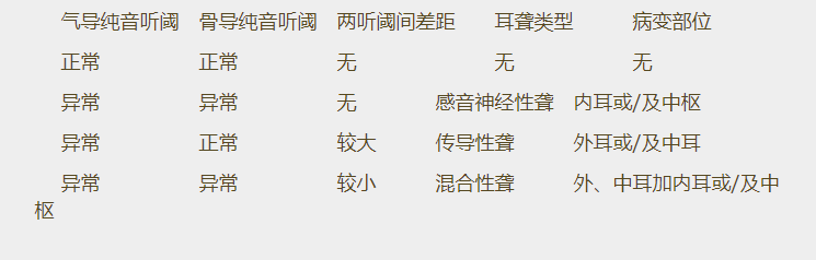 純音聽力檢查結(jié)果體現(xiàn)為純音聽力圖。</p><p> 正常情況下我們是通過兩條途徑來感受聲音信號的——氣導(dǎo)途徑和骨導(dǎo)途徑。前者我們非常熟悉,從外耳到中耳到內(nèi)耳到聽中樞;后者我們或許不太注意:從顱骨直接到內(nèi)耳到聽中樞。相應(yīng)地,純音聽力檢查也有兩種聲音剌激方式,氣導(dǎo)輸入和骨導(dǎo)輸入。前者我們天天使用,而后者則很少被我們使用。事實上,兩閾值曲線的異同正是我們判斷聽損病變部位的基礎(chǔ)(見下表)。了解患者病變部位對于獲得他們的信任以及確定助聽器電聲性能都有非同尋常的意義。因此,有條件的時候還是應(yīng)當(dāng)重視骨導(dǎo)聽閾測試。</p><p style="text-align: center;"><img src="/upfiles/201906100237368907.png" alt="" /><br /></p><p> 更多詳情請登錄聽覺有道助聽器www.hljhqw.com</p>" />