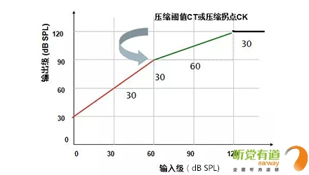 1、壓縮拐點(CK):線性放大與壓縮放大的臨界輸入級,此處為60 dB SPL,即輸入聲強度在60 dB SPL以下時為線性放大,超過60 dB SPL為壓縮放大。①紅線的輸入級范圍為0~60 dB,這段的聲音為線性放大,隨意找一個輸入級,用它對應的輸出級減去輸入級,得出線性放大的增益為30 dB;②當輸入級大于60 dB時,綠色曲線為壓縮放大,輸出與對應輸入的差值不再是30 dB,而是隨著輸入級增加,增益逐漸減小;③當輸出達到最大輸出限制時,輸出不再增大,保持在最大輸出限制位置。