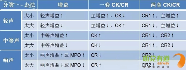 事實上,各企業的助聽器軟件往往可以直接調節輕聲增益、中等聲增益、大聲增益與主增益而間接控制壓縮參數,有的軟件可見一套CK/CR,有的軟件可見兩套CK/CR。有些軟件會自動默認為自適應壓縮方式,能夠根據聲音強度差異自動調整。