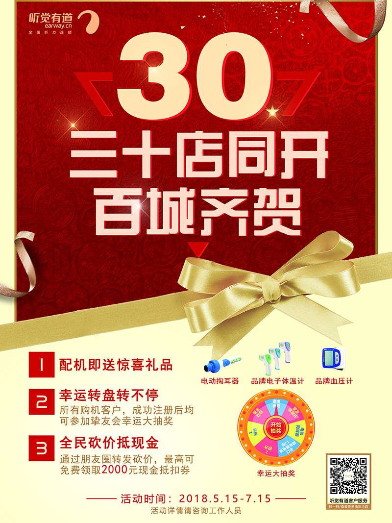 <span style="font-size:16px;"><img src="/upfiles/201805140533309372.jpg" alt="" /><br /></span></p><p style="text-align: center;"><span style="font-size:16px;"><br /></span></p><p><span style="font-size:16px;"> 聽覺有道助聽器驗配中心30家門店于5月15日正式開業,百城同慶!</span></p><p><span style="font-size:16px;"> 聽覺有道是一家高端、專業的全國聽力連鎖機構,有著近30年的助聽器驗配經驗,是廣東聽覺有道企業管理有限公司旗下品牌。</span></p><p><span style="font-size:16px;"> 公司現有專家級驗配師400多名,驗配服務中心遍布華西、華東、華南、華北主要省市,同時與GN集團進行戰略合作,代理美國貝爾通助聽器等助聽器品牌,擁有多條產品線:聽力篩查聽力篩查,聽力診斷,平衡診斷,助聽器驗配及專家級軟件(聽力診斷設備操作系統與患者信息服務管理系統),行業內領先的無線藍牙助聽器通訊技術,為聽障朋友提供一站式助聽器驗配解決方案!</span></p><p><span style="font-size:16px;"> 作為助聽器驗配行業的專業服務者,專業的驗配環境,專家級的驗配師,將時刻秉承專業全面的服務、豐富的驗配經驗及先進的驗配設備,同時為聽障朋友提供康復指導及助聽器售后服務,讓聽障朋友更好更放心地傾聽!</span></p><p style="text-align: center;"><span style="font-size:16px;"> <strong>我們的新門店地址(30家):</strong></span></p><p><span style="font-size:16px;"></span></p><p></p><p style="text-align: center;"><span style="font-size:16px;"> <strong>聽覺有道華南高端驗配中心</strong></span></p><p style="text-align: center;"><span style="font-size:16px;"><strong><img src="/upfiles/201805151039587785.png" alt="" /><br /></strong></span></p><p style="text-align: center;"><span style="font-size:16px;"> 電話:020-87066099</span></p><p style="text-align: center;"><span style="font-size:16px;"> 地址:廣州市天河區體育東路122號羊城國際商貿中心西塔1108(地鐵體育中心B出口前行100米,專家坐診,只接受預約)</span></p><p style="text-align: center;"><span style="font-size:16px;"><br /></span></p><p style="text-align: center;"><span style="font-size:16px;"> <strong>聽覺有道內蒙古呼市烏蘭察布服務中心</strong></span></p><p style="text-align: center;"><span style="font-size:16px;"><strong><img src="/upfiles/201805151040168591.png" alt="" /><br /></strong></span></p><p style="text-align: center;"><span style="font-size:16px;"> 電話:0471-3977839、13514714042</span></p><p style="text-align: center;"><span style="font-size:16px;"> 地址:內蒙古呼和浩特市賽罕區烏蘭察布東街路北(招商考試中心旁)</span></p><p style="text-align: center;"><span style="font-size:16px;"><br /></span></p><p style="text-align: center;"><span style="font-size:16px;"> <strong>聽覺有道成都金堂服務中心</strong></span></p><p style="text-align: center;"><span style="font-size:16px;"><strong><img src="/upfiles/201805151040458276.png" width="500" alt="" /><br /></strong></span></p><p style="text-align: center;"><span style="font-size:16px;"> 電話:17780478558</span></p><p style="text-align: center;"><span style="font-size:16px;"> 地址:成都市金堂縣趙鎮十里大道300號(一橫道路口)</span></p><p style="text-align: center;"><span style="font-size:16px;"><br /></span></p><p style="text-align: center;"><span style="font-size:16px;"> <strong>聽覺有道四川雅安服務中心</strong></span></p><p style="text-align: center;"><span style="font-size:16px;"><strong><img src="/upfiles/201805151041171639.png" alt="" /><br /></strong></span></p><p style="text-align: center;"><span style="font-size:16px;"> 電話:17738307596</span></p><p style="text-align: center;"><span style="font-size:16px;"> 地址:雅安市雨城區大南街22號(天主教堂對面)</span></p><p style="text-align: center;"><span style="font-size:16px;"><br /></span></p><p style="text-align: center;"><span style="font-size:16px;"></span></p><p style="text-align: center;"><span style="font-size: 16px;"> <strong>聽覺有道東營廣饒服務中心</strong></span></p><p style="text-align: center;"><span style="font-size: 16px;"><strong><img src="http://www.hljhqw.com/upfiles/20180515104347120.png" alt="" /><br /></strong></span></p><p style="text-align: center;"><span style="font-size: 16px;"> 電話:0546-6281512</span></p><p style="text-align: center;"><span style="font-size: 16px;"> 地址:東營市廣饒縣花苑路與兵圣路十字路口東行20米路北(醫藥公司對面)</span></p><p style="text-align: center;"><span style="font-size: 16px;"><br /></span></p><p style="text-align: center;"><span style="font-size: 16px;"> <strong>聽覺有道河南洛陽服務中心</strong></span></p><p style="text-align: center;"><span style="font-size: 16px;"><strong><img src="http://www.hljhqw.com/upfiles/201805151044003400.png" alt="" /><br /></strong></span></p><p style="text-align: center;"><span style="font-size: 16px;"> 電話:0379-64324338、16637990858</span></p><p style="text-align: center;"><span style="font-size: 16px;"> 地址:河南省洛陽市澗西區景華路8號(潤峰廣場正對面)</span></p><p style="text-align: center;"><span style="font-size: 16px;"><br /></span></p><p style="text-align: center;"><span style="font-size: 16px;"> <strong>聽覺有道山東聊城服務中心</strong></span></p><p style="text-align: center;"><span style="font-size: 16px;"><strong><img src="http://www.hljhqw.com/upfiles/201805151044136324.png" alt="" /><br /></strong></span></p><p style="text-align: center;"><span style="font-size: 16px;"> 電話:0635-8800602,15653110810</span></p><p style="text-align: center;"><span style="font-size: 16px;"> 地址:山東省聊城市東昌府區興華西路2號(五星百貨斜對面)</span></p><p style="text-align: center;"><span style="font-size: 16px;"><br /></span></p><p style="text-align: center;"><span style="
