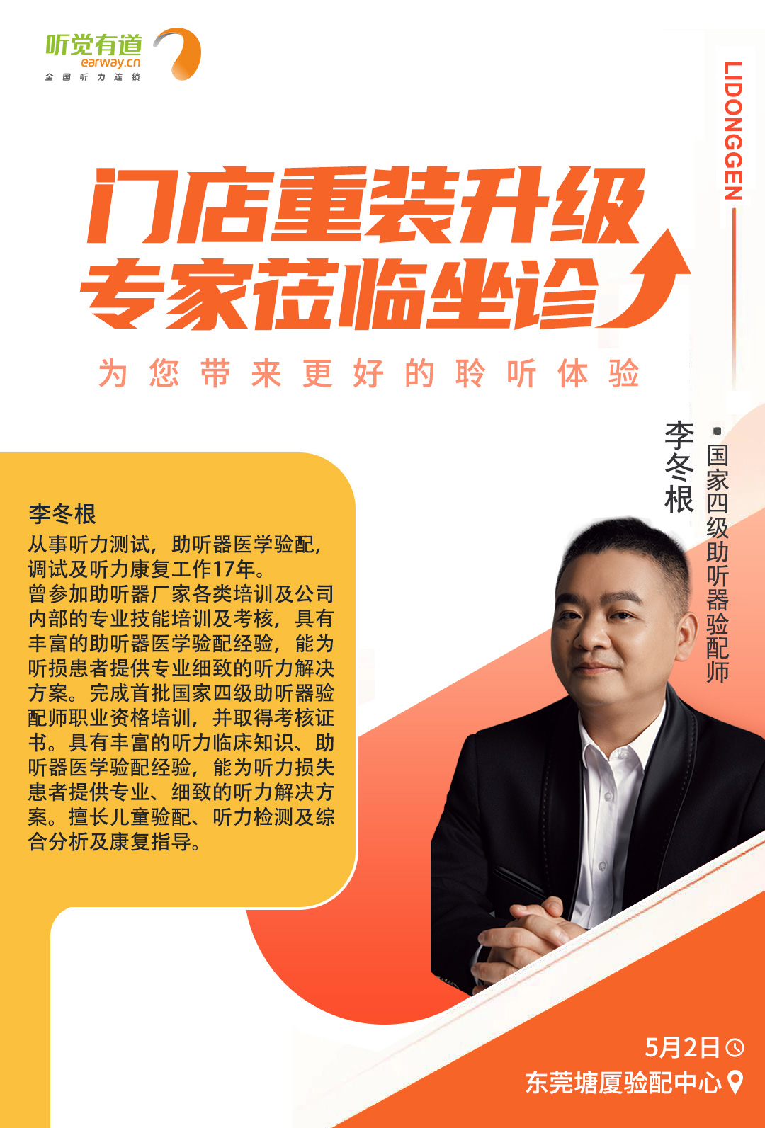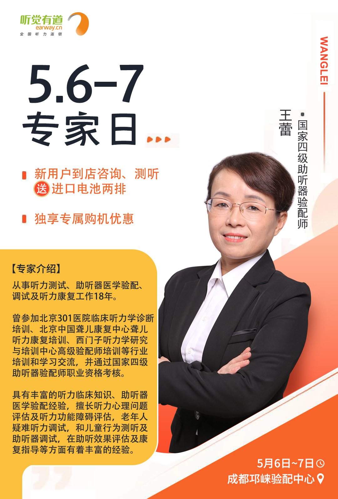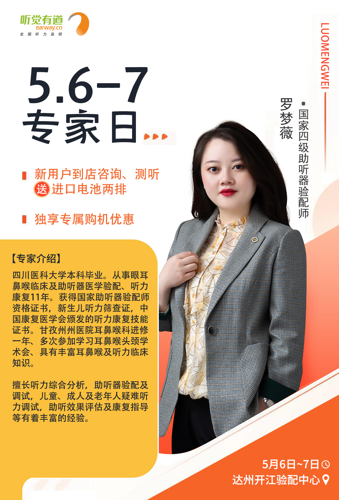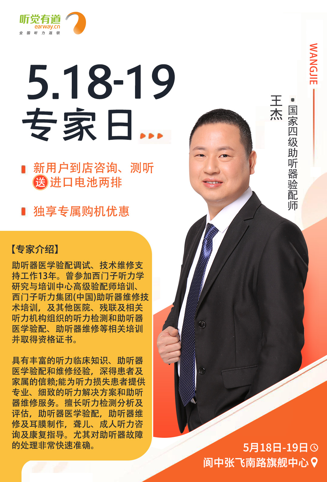 <span style="white-space:pre"> </span>為了更好地服務(wù)聽損人士,帶來高質(zhì)量的聆聽感受,聽覺有道全國聽力連鎖將持續(xù)開展專家入店活動(dòng)。<br /></span><p><span style="font-size:16px;"> 專家日現(xiàn)場,聽覺有道金牌聽力專家將為您解答聽力相關(guān)問題,調(diào)試和驗(yàn)配助聽器,讓您能夠更好地聆聽這個(gè)世界的美好。</span></p><p style="text-align: center;"><img src="/upfiles/202104300114022603.jpg" width="640" alt="" /><br /></p><p style="text-align: center;"><br /></p><span style="font-size:16px;"> <strong>活動(dòng)預(yù)告<br /><br /> 聽覺有道專家入店行程表</strong><br /><br /> 聽覺有道東莞塘廈驗(yàn)配中心<br /> 時(shí)間:5月2日<br /> 專家:李冬根<br /> 電話:0769-87927386<br /> 手機(jī):18923091281<br /> 地址:廣東省東莞市塘廈鎮(zhèn)塘廈大道中70-108號(水電三局對面)<br /><br /> 聽覺有道達(dá)州開江驗(yàn)配中心<br /> 時(shí)間:5月6日~7日<br /> 專家:羅夢薇<br /> 電話:0818-8222079<br /> 手機(jī):19182813889<br /> 地址:四川省達(dá)州市開江縣新寧鎮(zhèn)龍池街77號(開江縣人民醫(yī)院正門對面)<br /><br /> 聽覺有道成都邛崍驗(yàn)配中心<br /> 時(shí)間:5月6日~7日<br /> 專家:王蕾<br /> 電話:028-88734181<br /> 手機(jī):18908177682<br /> 地址:四川省邛崍市鳳凰大道484號高宇南庭(醫(yī)療中心醫(yī)院對面)<br /><br /></span><span style="white-space:pre"><span style="font-size:16px;"> 聽覺有道閬中張飛南路旗艦中心<br /> 時(shí)間:5月18日~19日<br /> 專家:王杰<br /> 電話:0817-6250177<br /> 手機(jī):17398130629<br /></span></span><p><span style="white-space:pre"><span style="font-size:16px;"> 地址:四川省閬中市張飛南路126號(人民醫(yī)院正對面)</span></span></p><p style="text-align: center;"><img src="/upfiles/202104300134599048.jpg" width="640" alt="" /> <img src="/upfiles/202104300134592952.jpg" width="640" alt="" /> <img src="/upfiles/202104300134592080.jpg" width="640" alt="" /><br /></p><p style="text-align: center;"><img src="/upfiles/202104300135382254.jpg" width="640" alt="" /><br /></p><p style="text-align: center;"><br /></p>" />