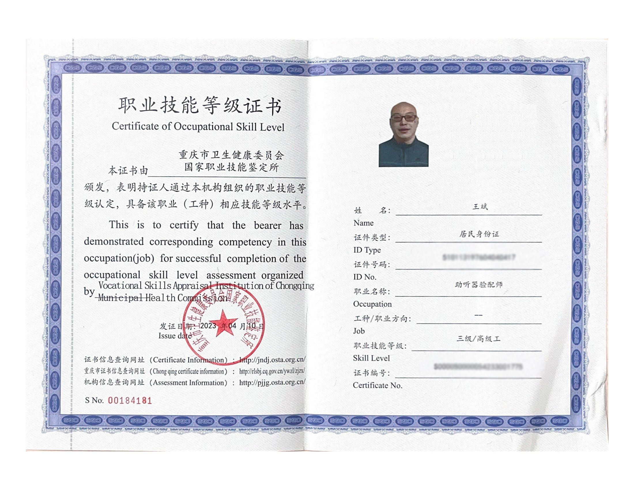 該職業技能等級證書由重慶市衛生健康委員會國家職業技能鑒定所頒發。該鑒定所也是2020年底助聽器驗配師考試改革后,全國備案成功的首家衛健委系統鑒定機構,具有權威性。