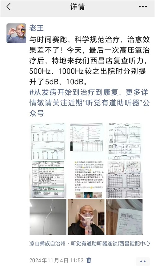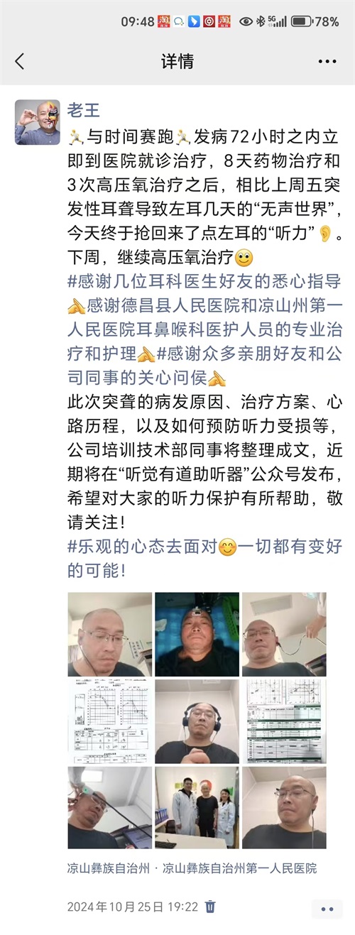 回想起發病初期,王總表示,當自己突然失去聽力,完全與外界隔絕的那一刻,內心充滿了無助與恐懼。幸運的是,由于他長期深耕聽力行業,對聽力受損有著較為深入的了解、明白:突聾聽力救治時間為黃金72小時內。因此能夠識別癥狀并及時就醫,從而得到了有效的治療。