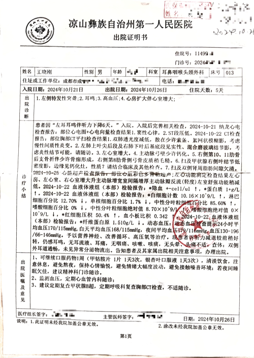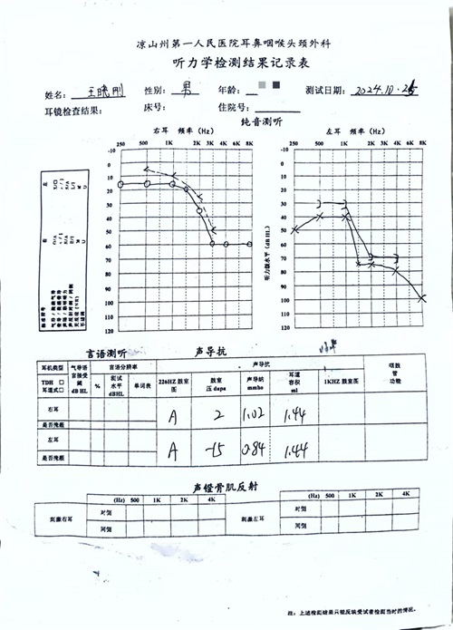 聽覺有道全國聽力連鎖聯合創始人王曉剛先生,期間或因工作過度操勞,于2024年10月16日的夜晚,耳道內突然響起了一聲“砰”的異響。次日,他的耳內又相繼出現了“噗噗”聲、“滋滋”聲的雜音,與人交談時,聽不清、甚至聽不到對方的話語變得愈發顯著。