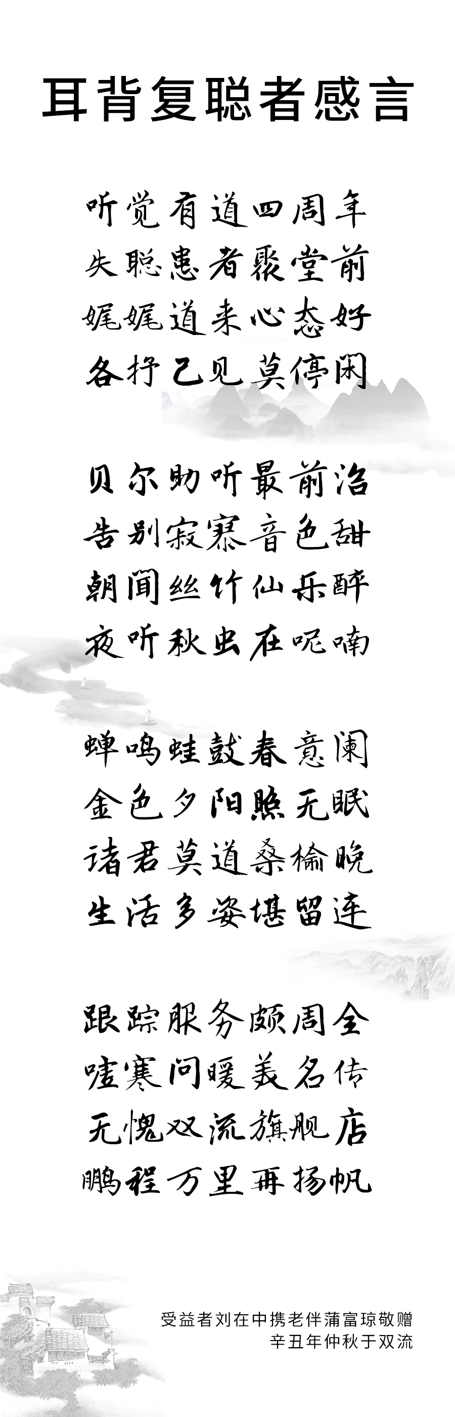辛丑年仲秋,聽覺有道雙流旗艦店四周年慶將至,劉在中老先生有感而發(fā),作詩一首,以表對驗配師服務工作的認可。